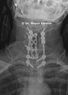A 65-year-old lady with chronic renal failure complained of pain in the neck and gradual difficulty in walking.